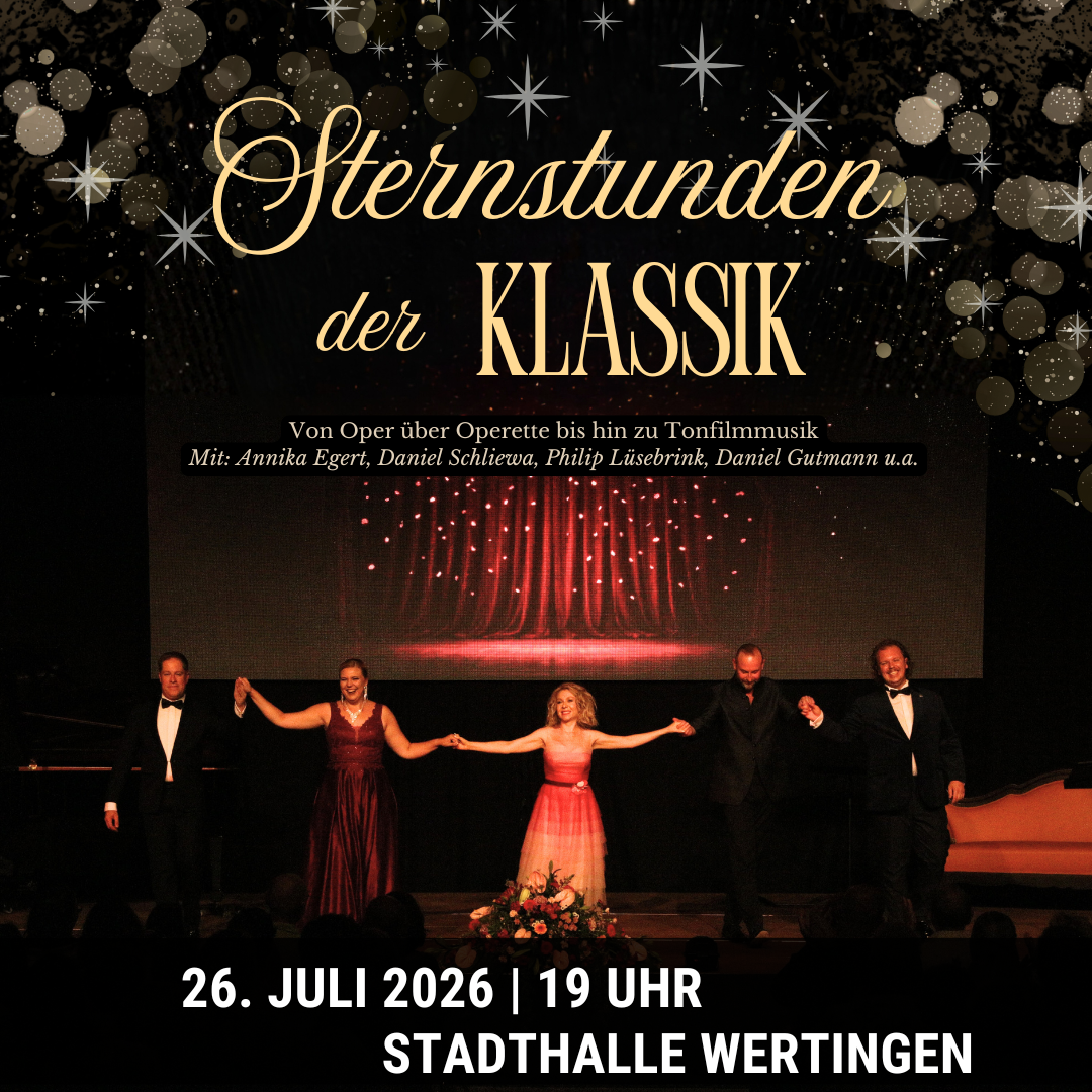 Mit einem festlichen Abschlusskonzert verabschieden sich die Wertinger Festspiele 2025.„Sternstunden der Klassik“vereint ein erstklassiges Ensemble international renommierter Künstler auf der Bühne und setzt gemeinsam einen glanzvollen, klangvollen Schlusspunkt voller musikalischer Strahlkraft.